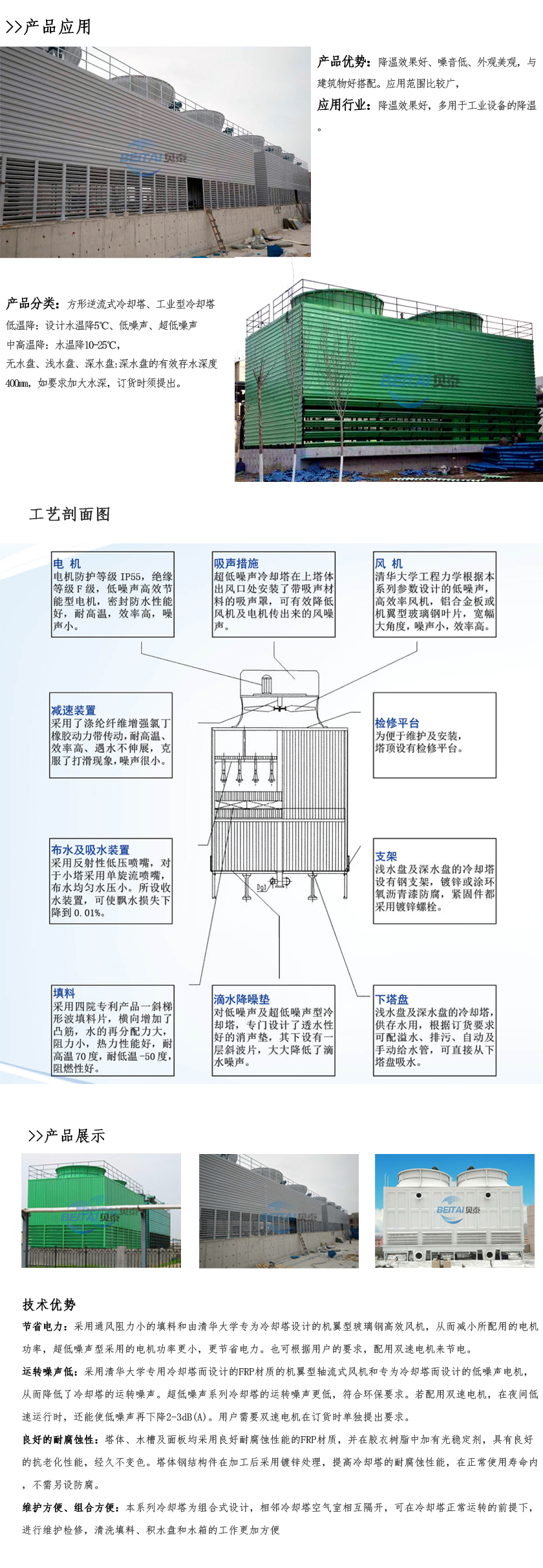 工業(yè)型玻璃鋼冷卻塔,室友機械工業(yè)部第四設(shè)計研究院在原設(shè)計的同類塔測試數(shù)據(jù)基礎(chǔ)上改進設(shè)計的。本設(shè)計的特點是冷卻塔風(fēng)機配有變扭矩雙速電機;當氣溫較低時,例如晚上,電機開低速,冷卻噪聲可低3-5dB(A)。此外,選用雙速電機節(jié)電顯著。多臺冷卻塔配單速電機時,為了節(jié)電,當空氣濕球溫度低時,可停部分電機,但仍比用雙速電機(以年計)多耗電40%。