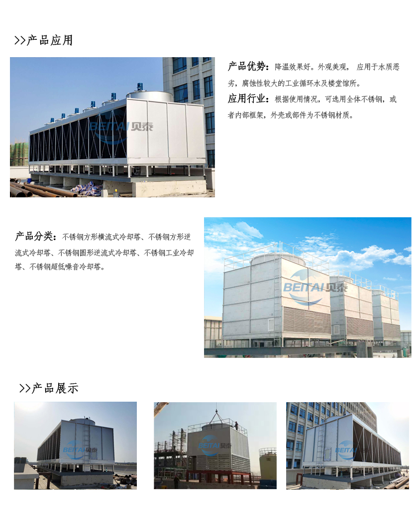 不銹鋼方型冷卻塔是根據(jù)產(chǎn)品的使用特點,揉合國外先進的熱交換技術與工藝生產(chǎn)科學管理,獨創(chuàng)于熱交換技術的冷卻塔.它具有重量輕、體積小、效率高、能耗低、便維修等一系列比使用常規(guī)冷卻塔佳的特點。